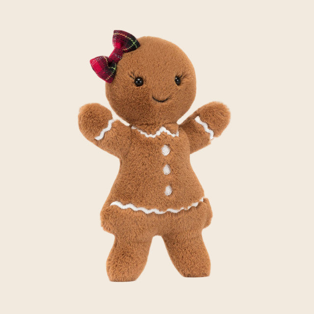 Jolly Gingerbread Ruby can't wait for Christmas! She's all glammed up in a stitched icing dress and her cosy fur is baked to perfection. With embroidered lashes and a tartan hair bow, and biscuit arms aloft, Ruby shines!