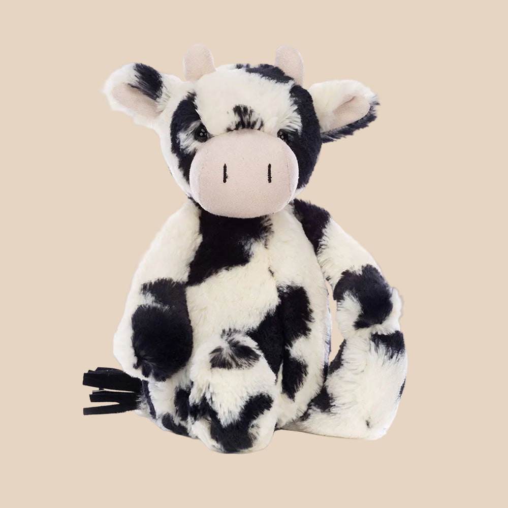 Scrumping apples? Not Bashful Calf. She’s a daisy-munching, kooky little cow, who enjoys listening to songs about farm life. With her soft white horns and lovely splotchy fur, she's so happy she jumped over the moon!
