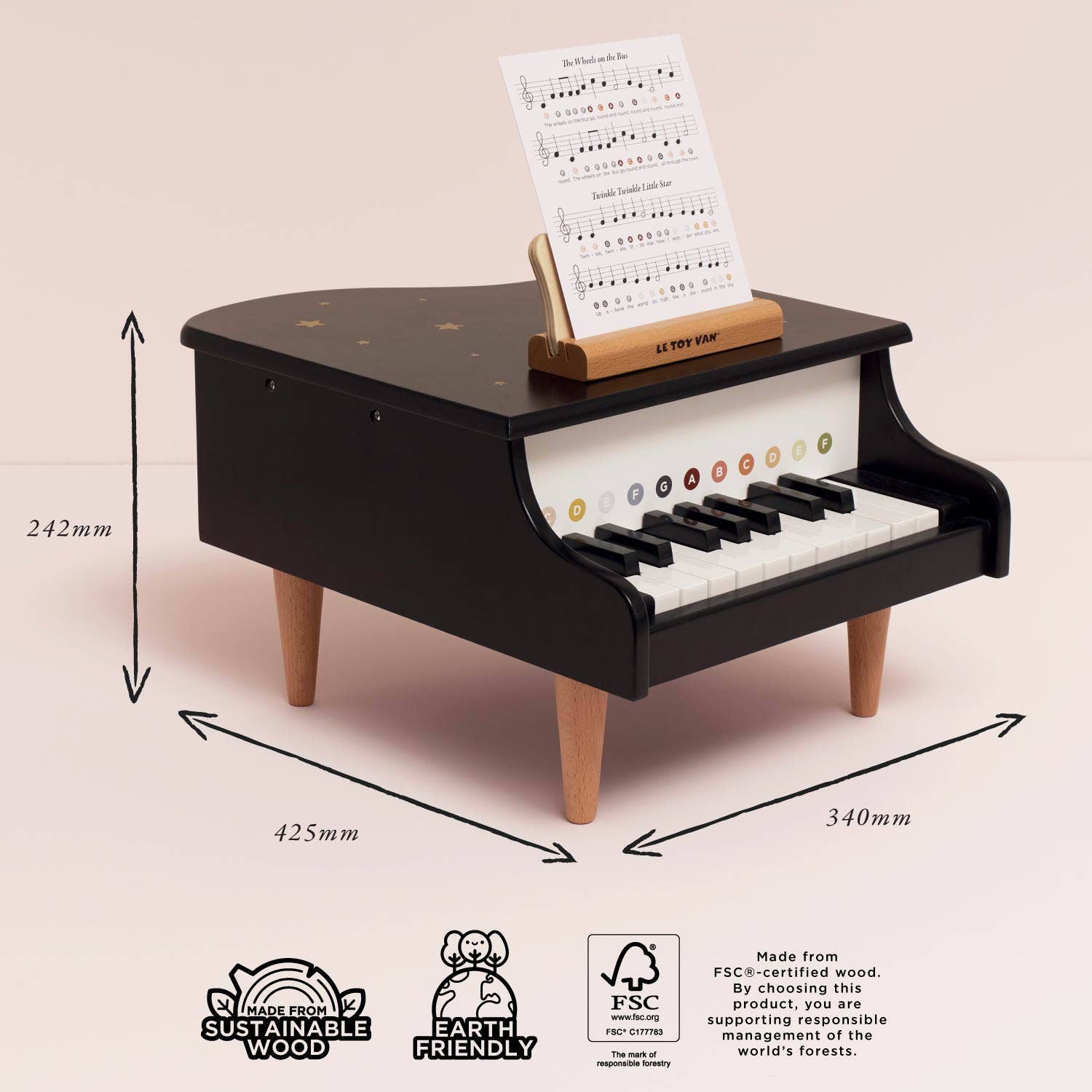 Inspire a love for music with this beautifully crafted Wooden Grand Piano Toy made from FSC®-certified wood, designed for budding musicians. Made from sustainable wood and painted in an elegant black finish adorned with delicate gold stars, this charming instrument brings both style and creativity to playtime. Featuring sturdy wooden feet for stability, it is built to last. The piano comes with two double-sided music sheets featuring eight popular nursery rhymes, allowing children to follow along and develop early musical skills. The wooden music stand securely holds the sheets in place, making it easy for little hands to explore the joy of playing. Perfect for encouraging creativity, coordination, and a passion for music, this timeless piece is both a beautiful toy and a cherished keepsake for years to come.
