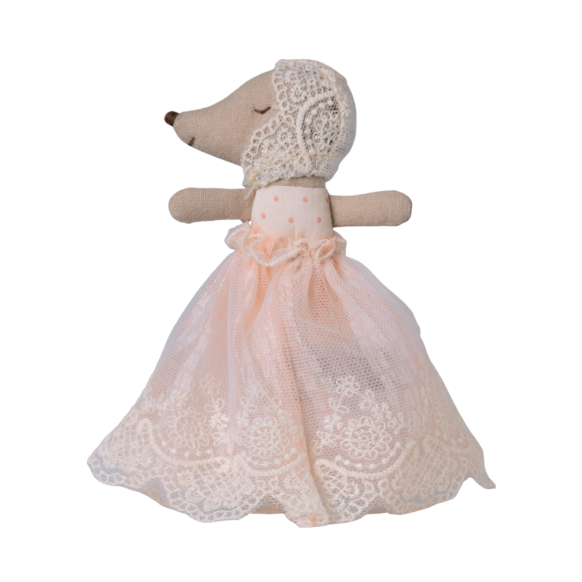This baby mouse is dressed up for a day of celebration with a lovely dress and small bonnet full of beautiful details. Add baby mouse accessories to extend the story.