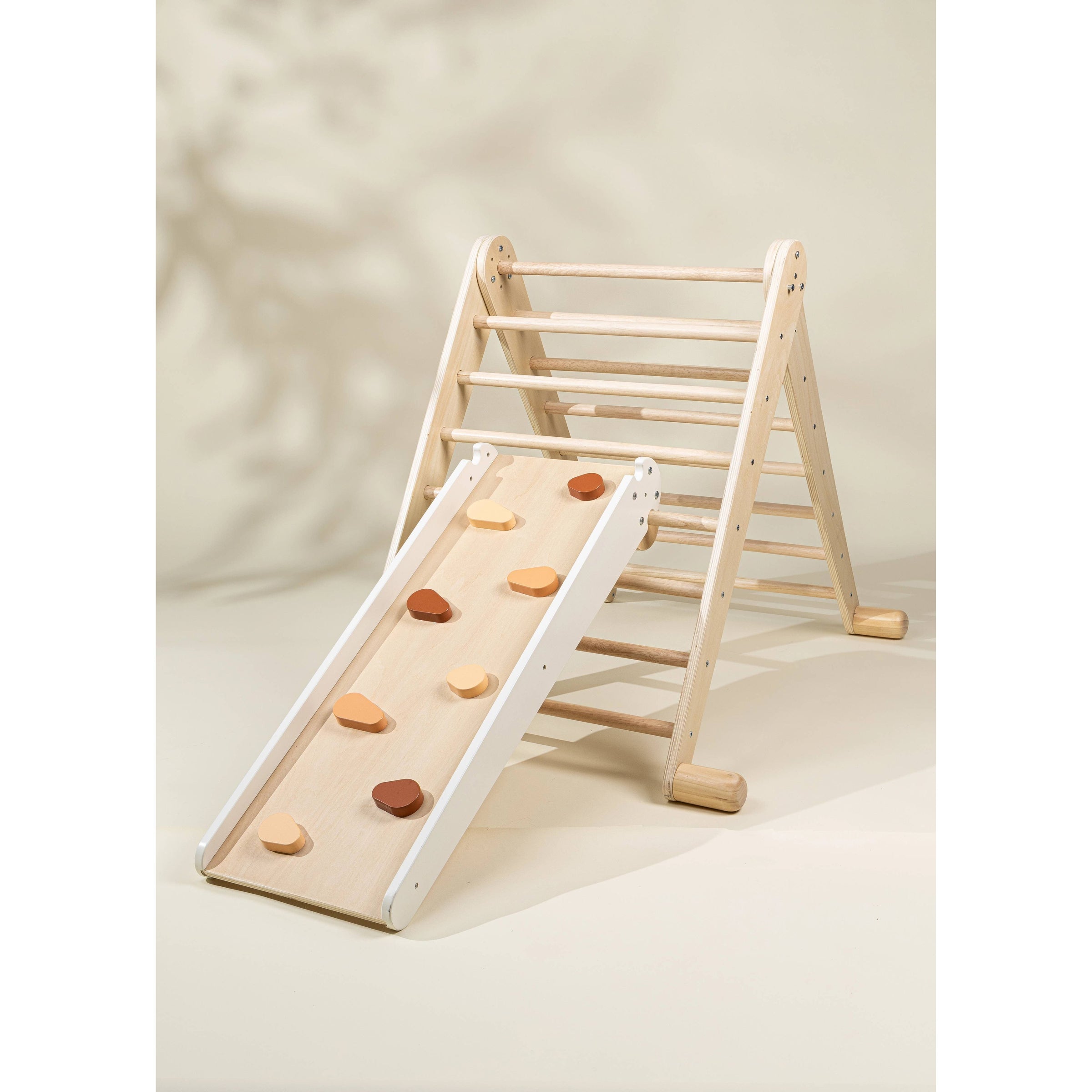 Introduce your child to endless fun and development with the Montessori 2-in-1 Triangle & Wall Climber. This versatile, reversible climbing wall offers both a slide and climbing surface, doubling the excitement for active play. Perfect for young explorers, it encourages balance, strength, and coordination while promoting creativity, imagination, and problem-solving skills. Designed to support your child's physical and cognitive growth, this indoor-only piece is crafted with safety and durability in mind.