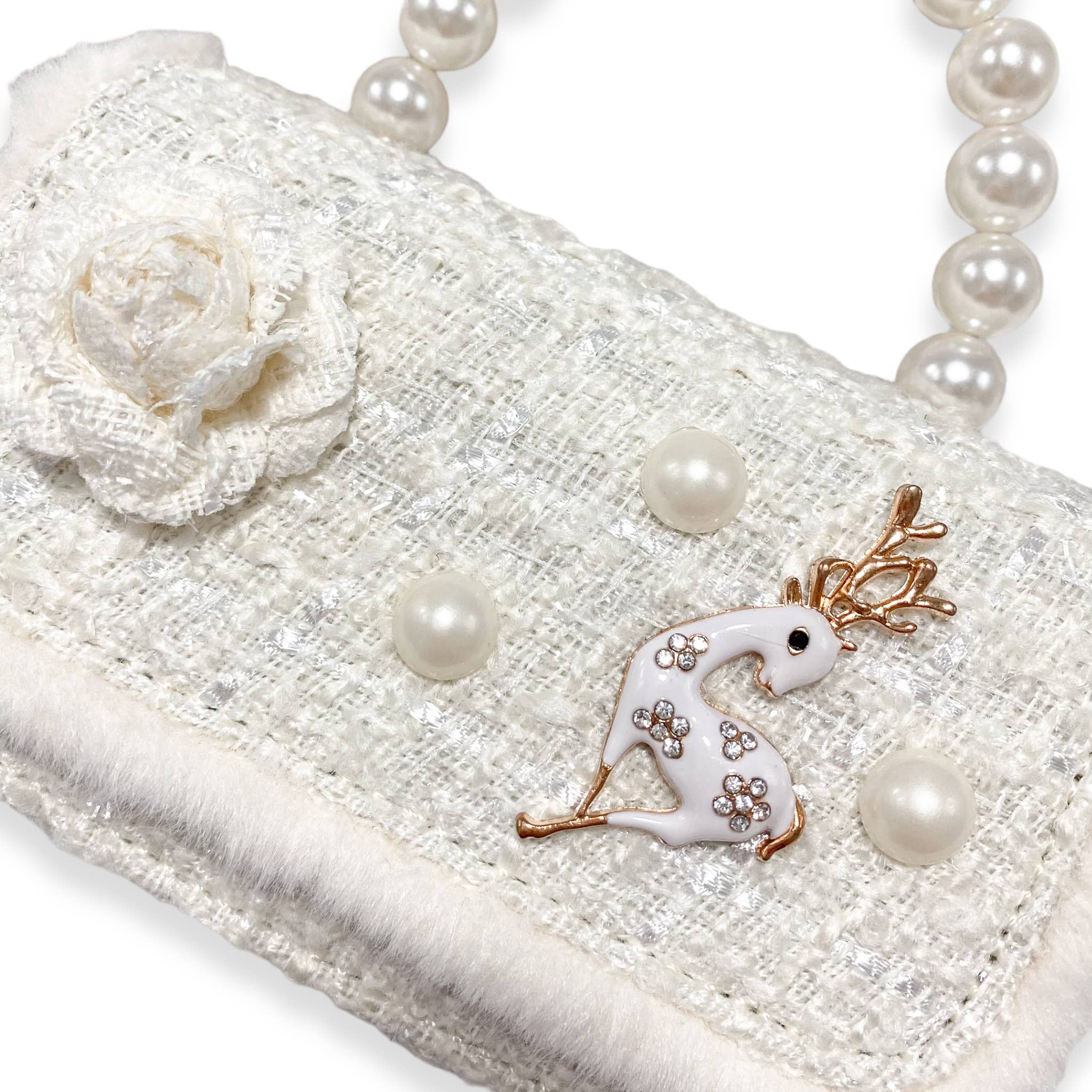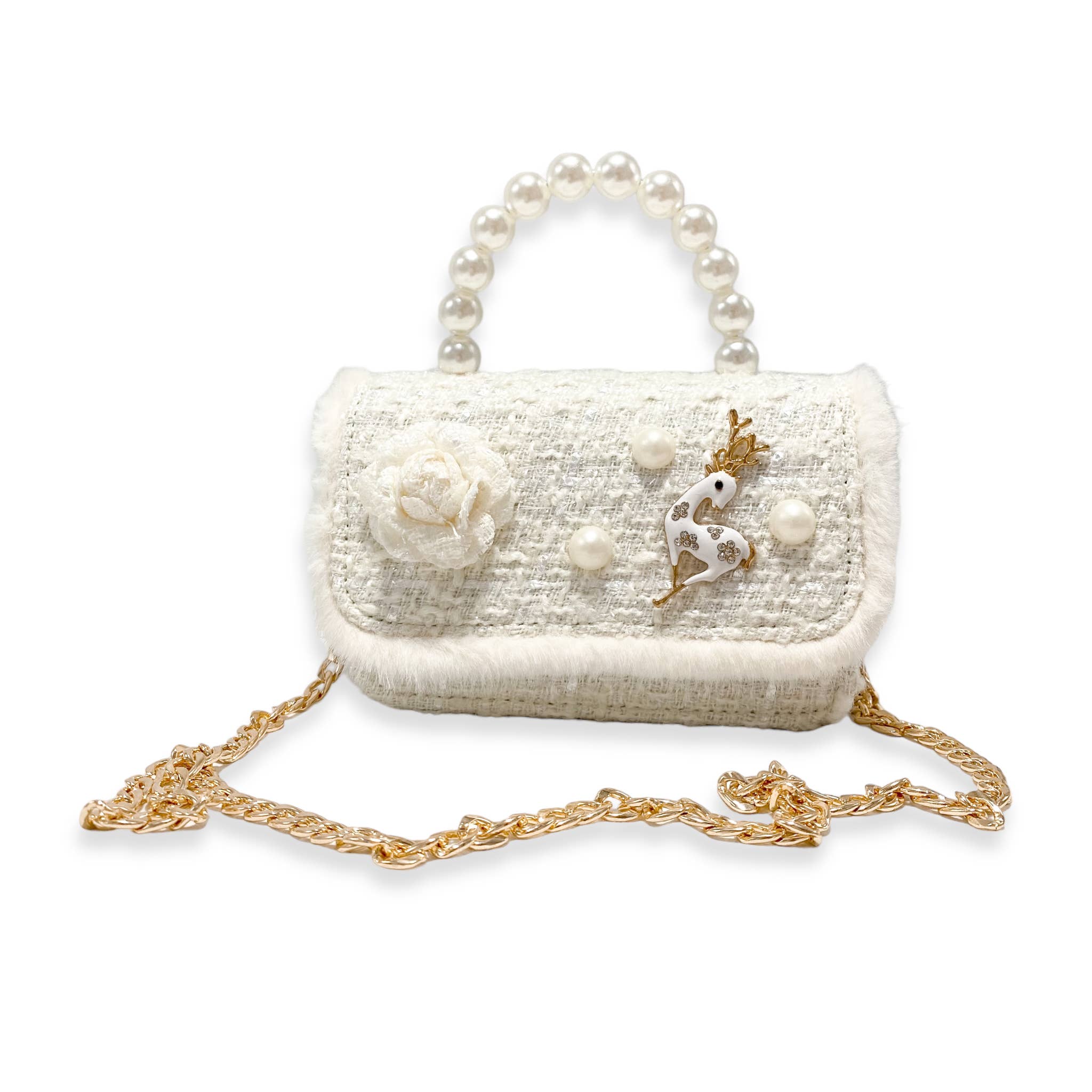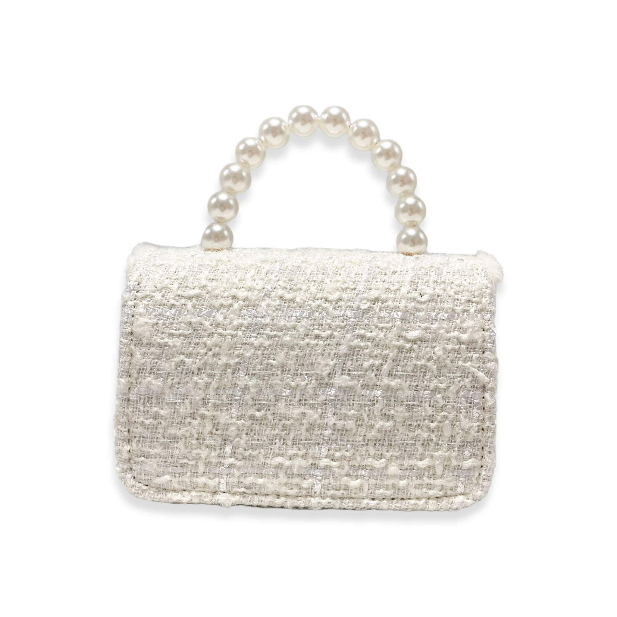 This elegant tweed purse is a true classic! The cute charms on the front lean into an elevated design that match perfectly with the pearl handle. A detachable gold chain is included as well!