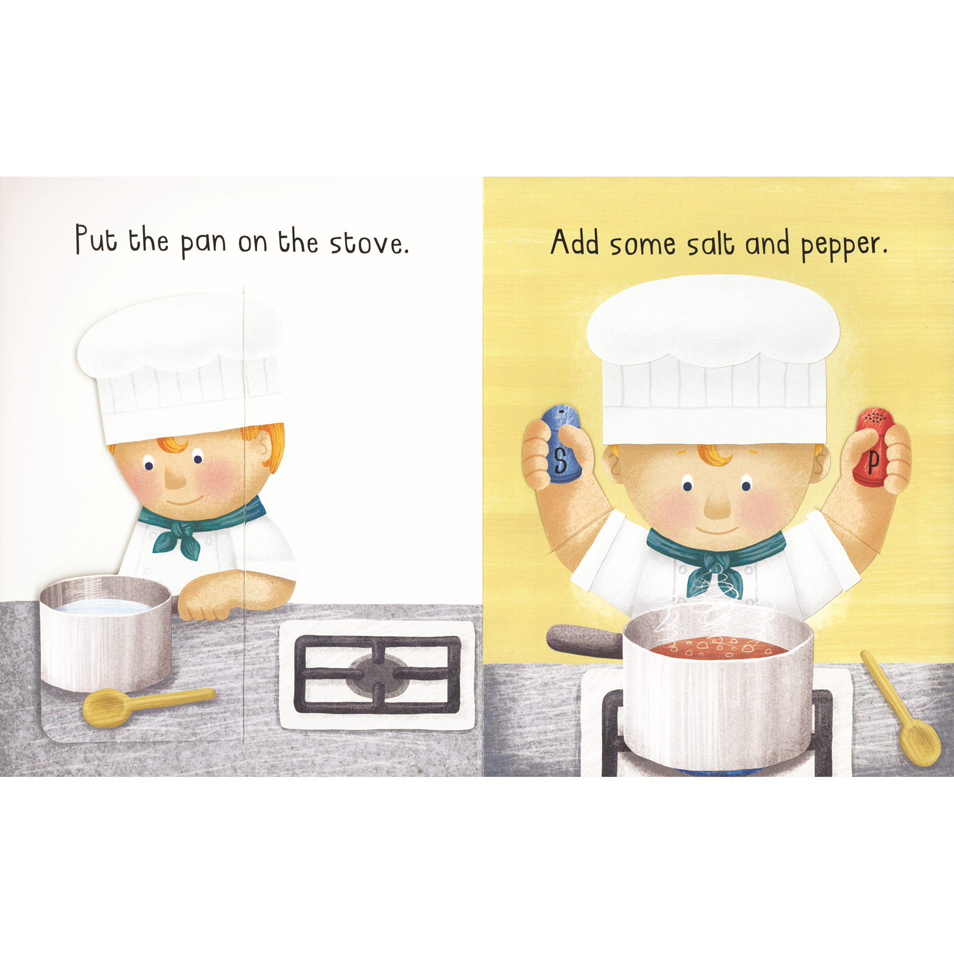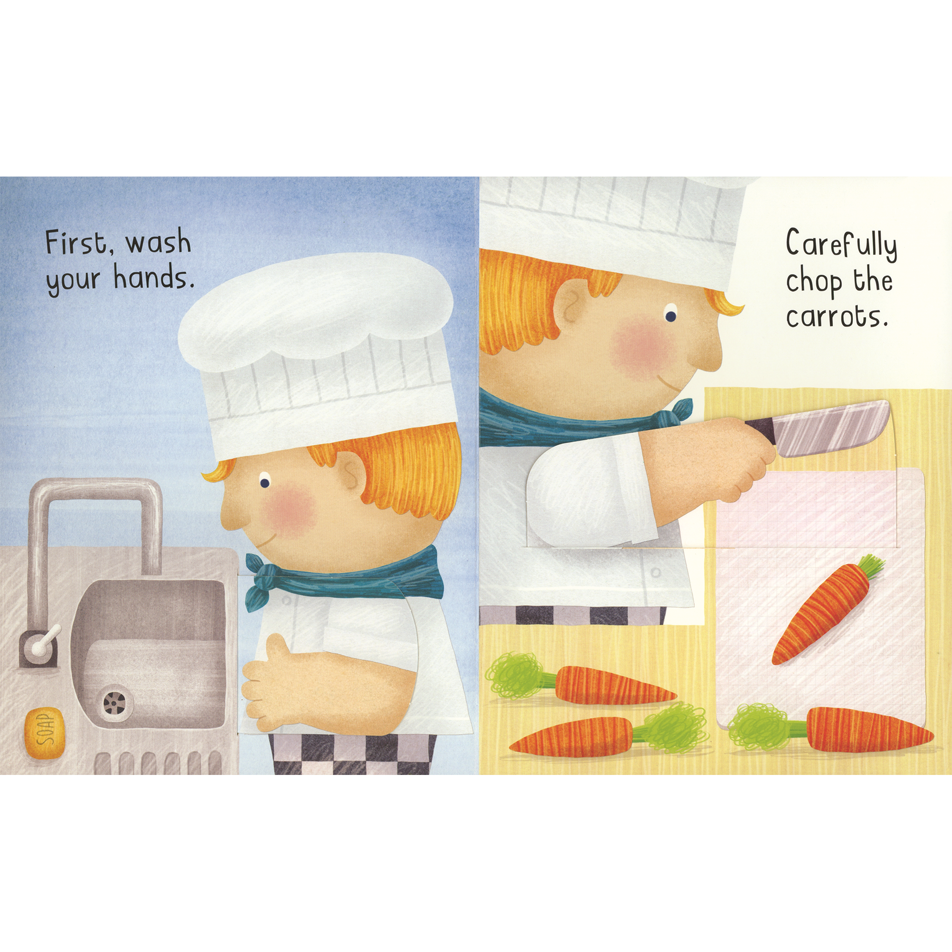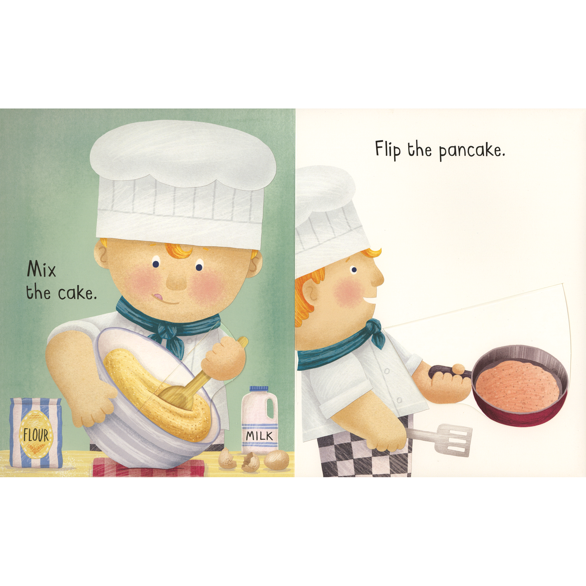 An interactive series to introduce a diverse range of jobs and daily routines through cleverly constructed flaps, simple, friendly text, and charming illustrations. Help the busy chef as he flips the pancake, chops the carrots, and bakes the cake. Board book. 12 Pages.