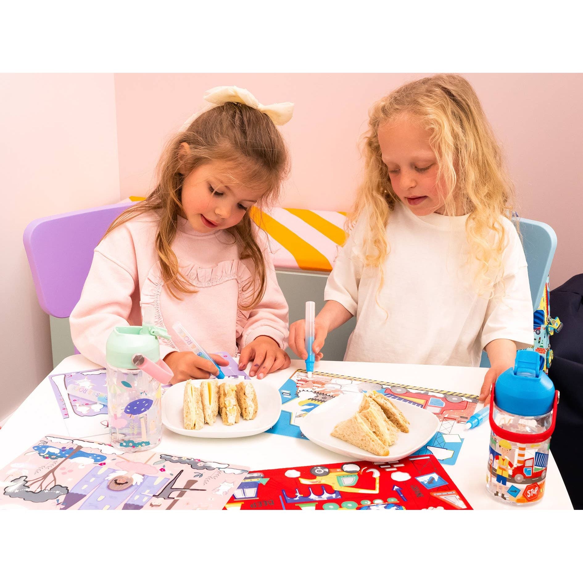 Enchanted-themed water placemats that turn mealtime into an interactive art experience. Paint with water to unveil hidden colors on two double-sided mats, then watch them fade back to white as they dry—ready for the next creative session. Completely mess-free, infinitely reusable, and portable for dining at home or away. Includes water pen and storage pouch.