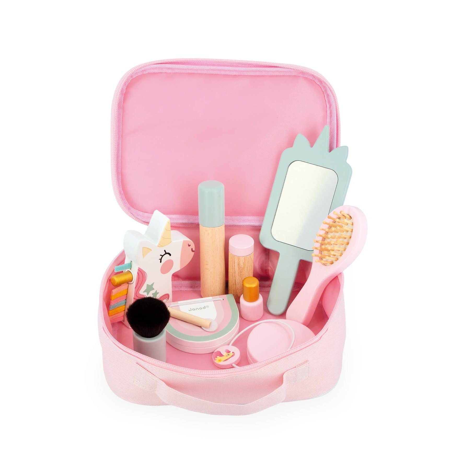 Thanks to this pretty unicorn-themed case, children will develop their imagination, get dolled up and have fun playing play pretend! Contains 10 wooden accessories: 1 mirror, 1 eyeshadow palette with applicator, 1 lipstick, 1 nail varnish, 1 mascara, 1 brush, 1 blush brush, 1 blusher, 1 hair band and 1 unicorn perfume bottle: press its mane to make its tongue stick out! Pretend play toy made for children ages 3 and up.