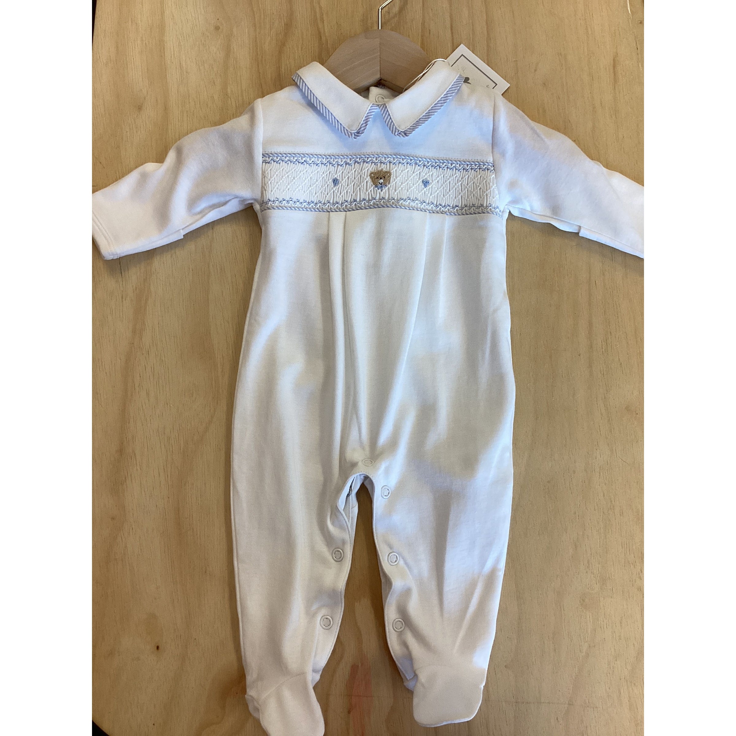 Wrap your little one in cozy softness with the Bear Smock Pima Footie. Made from gentle pima cotton in charming white and light blue, this footie features convertible mittens to keep tiny hands warm and protected. Perfect for playful days and peaceful naps, it combines comfort and cuteness in one snug outfit.