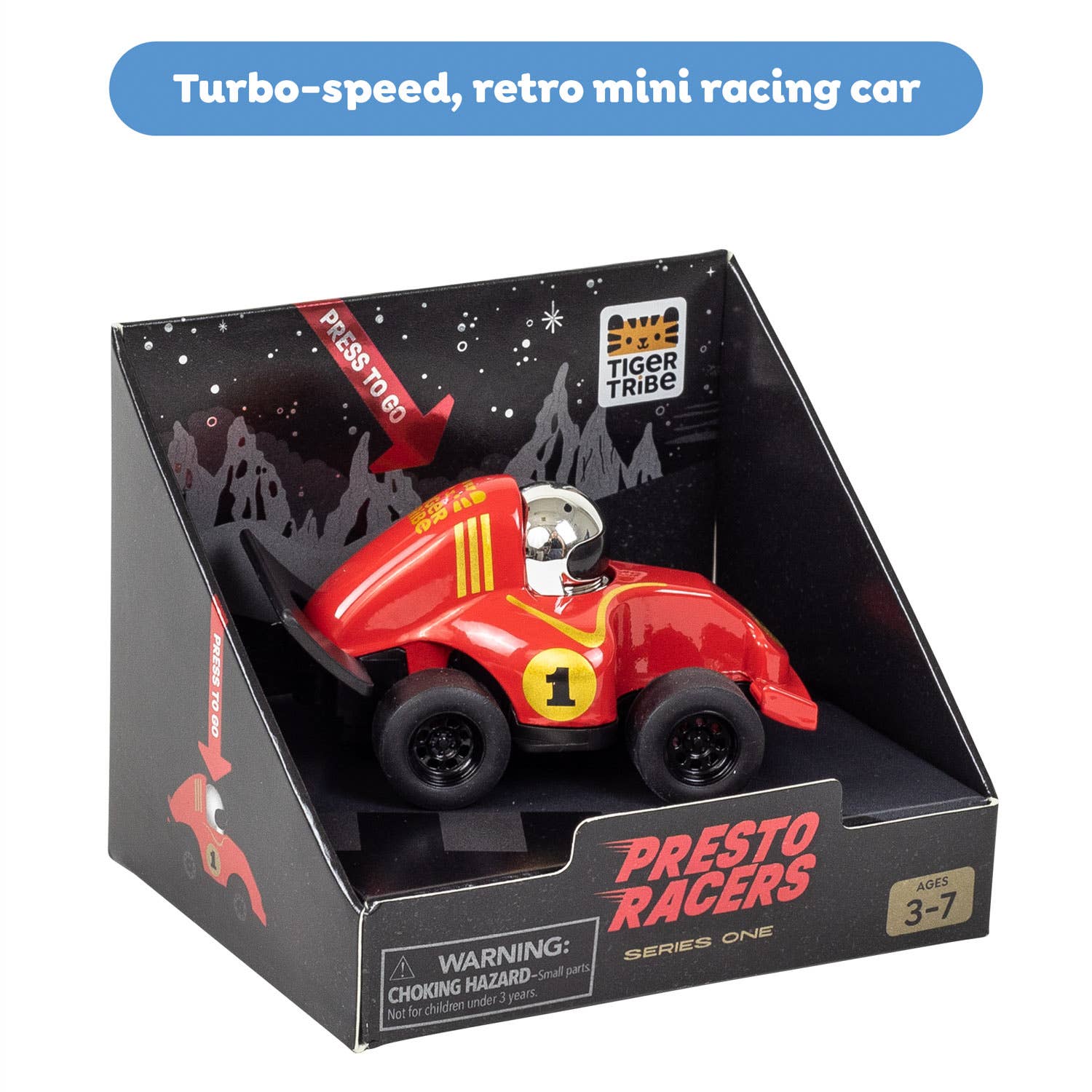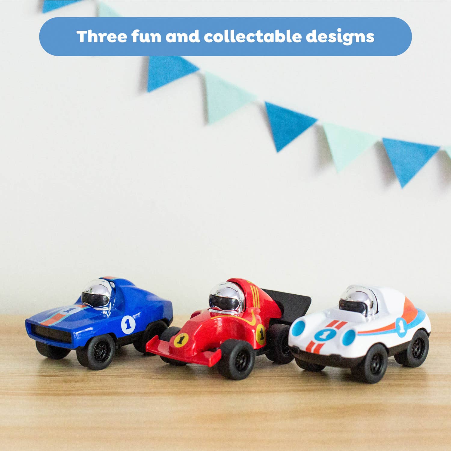 Hey, presto! These turbo-speed, battery-free retro mini racing cars are ready to roll! Kids will have a hoot racing these nimble little diecast Racers, activating the racing mechanism with a simple push-down, and they’re off! In three fun and collectable designs