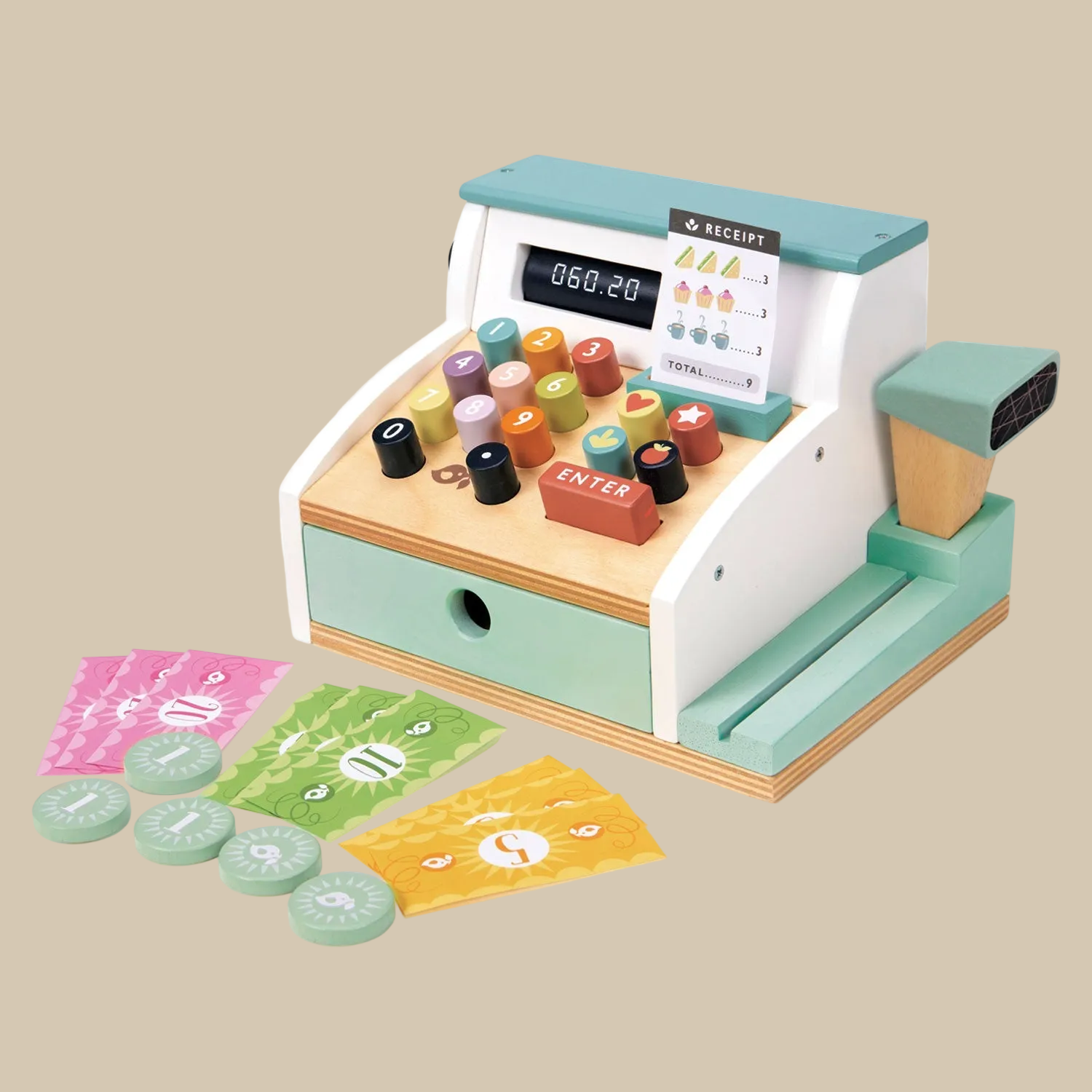 Ring up all your groceries with this fun and colorful wooden till with scanner. Slide your credit card along the groove, pop one of 5 printed receipts into a slot, turn the little knob to show different prices through a window, press down on the multi-colored squidgy buttons and open the tray to dispense 5 wooden coins and 9 sheets of colored paper money.