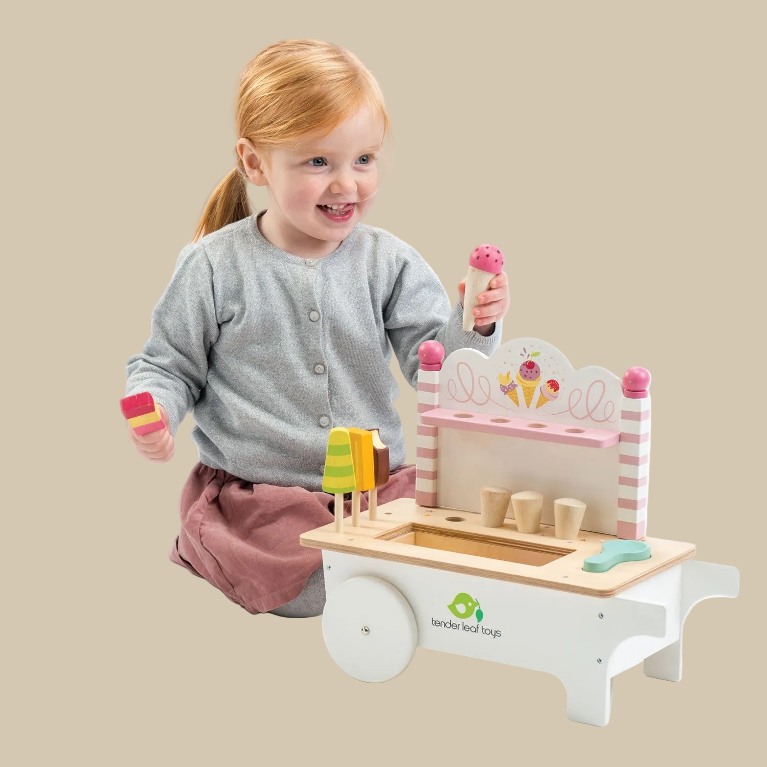 Who doesn't love an ice cream? A gorgeous wooden push along cart on wheels, with 4 wooden ice lollies, 4 cornets, 4 magnetized colorful ice creams, a magnetic ice cream scoop and a removable lid to reveal tubs on the underside. All painted in the most gorgeous yummy colors and great for shared pretend play.