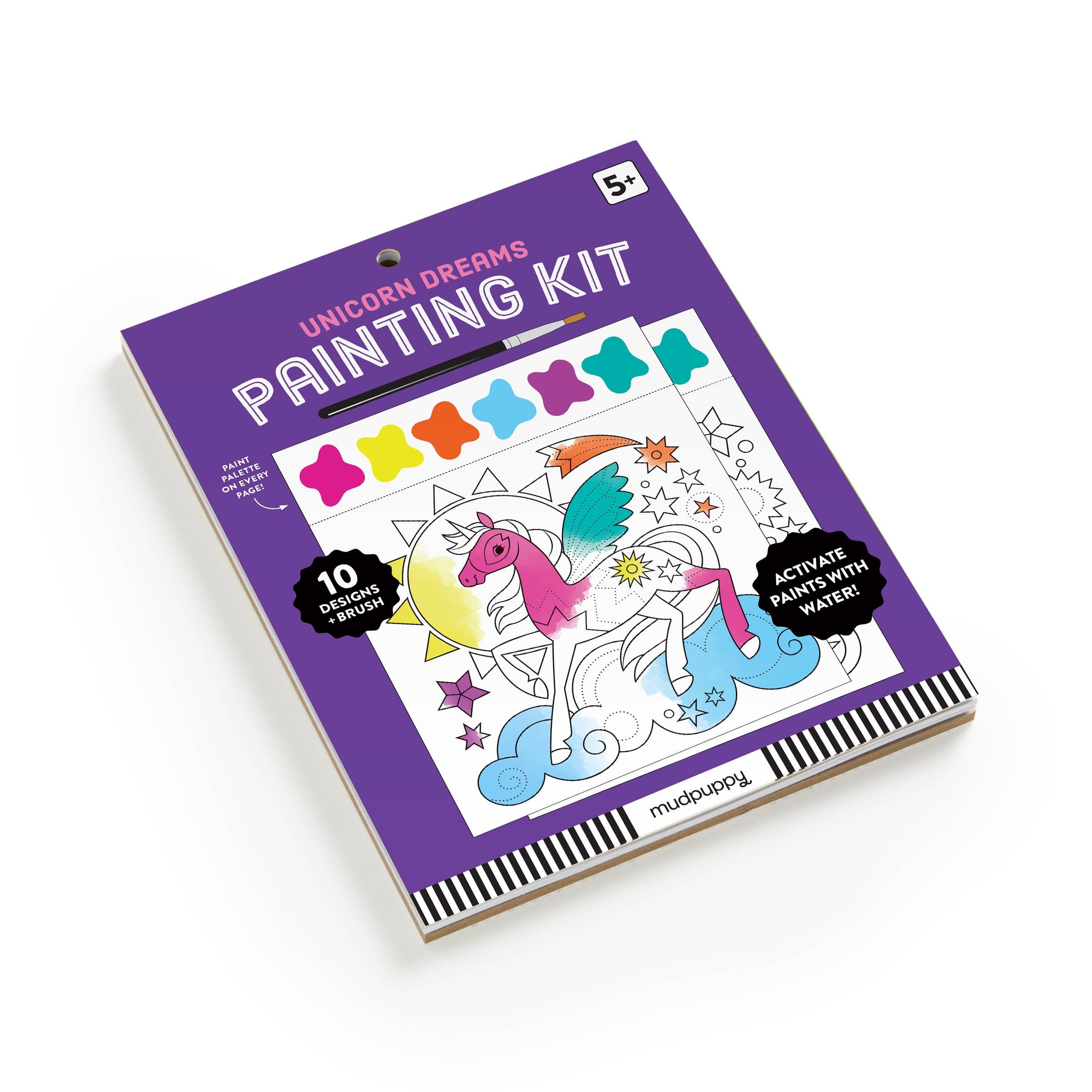PAINTING KIT – The Unicorn Dreams Painting Kit from Mudpuppy includes 10 paintable cards each with a unique unicorn themed illustration as well as a built-in watercolor paint palette at the top of each card and a watercolor brush which is neatly packaged in place with a cardboard insert at the back of the pad.