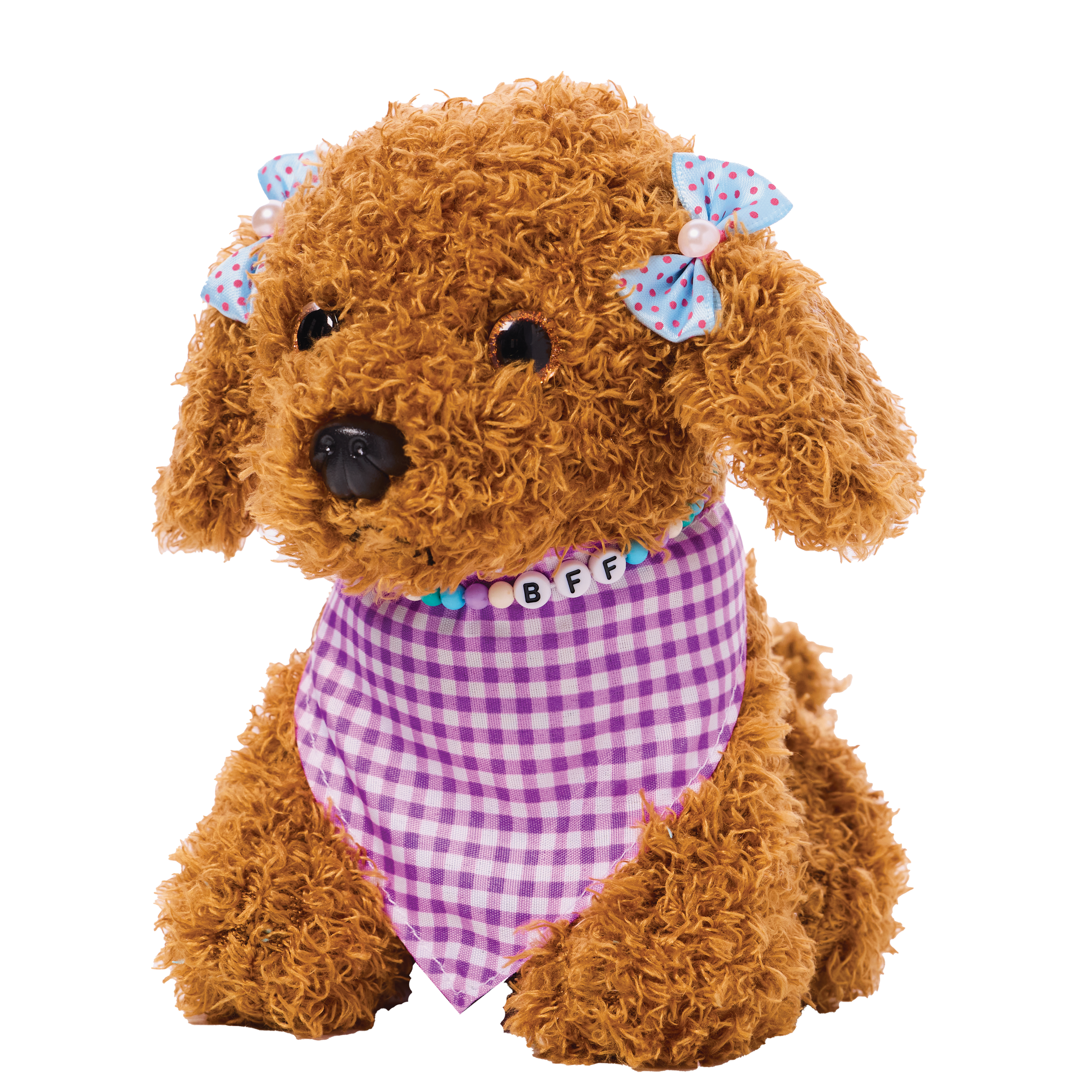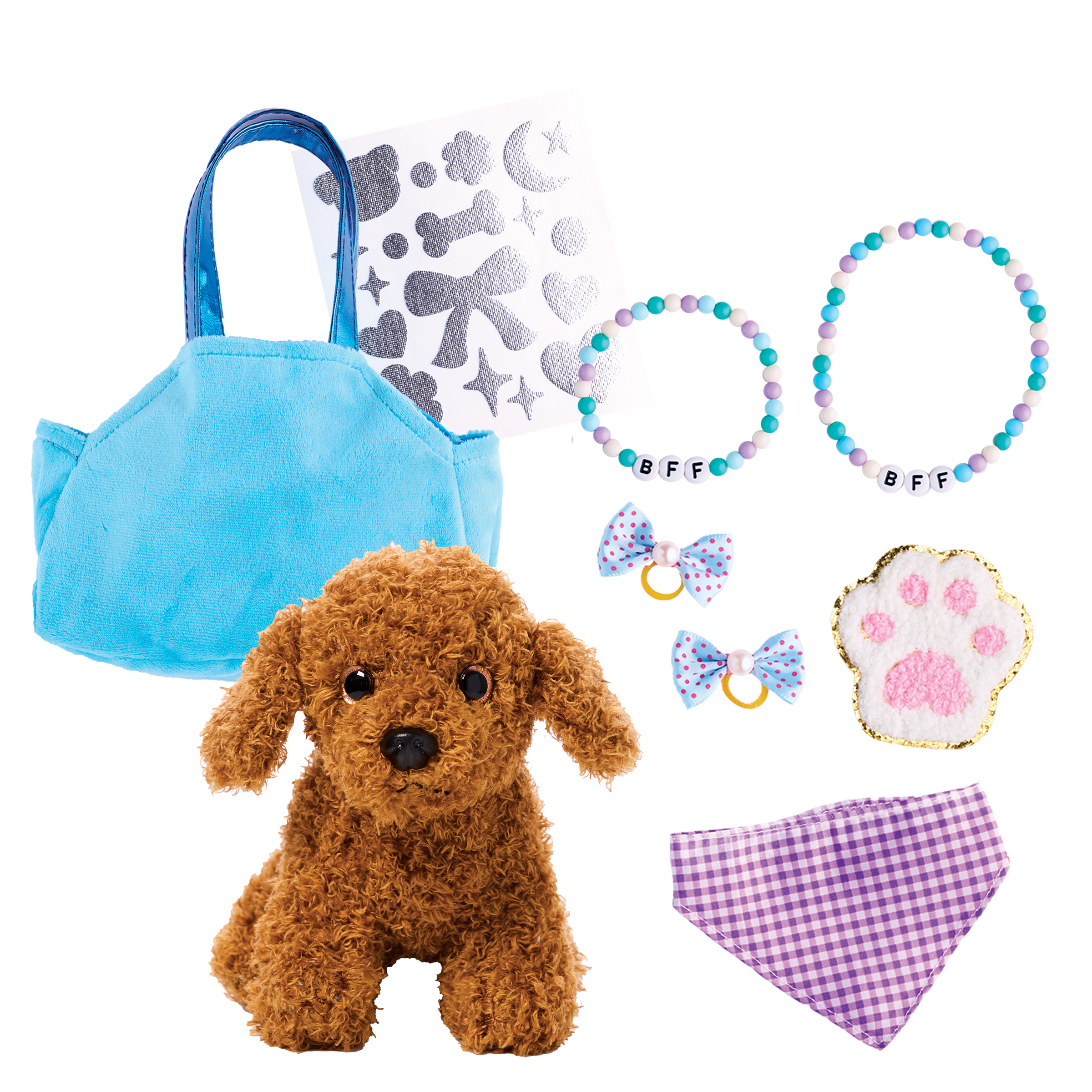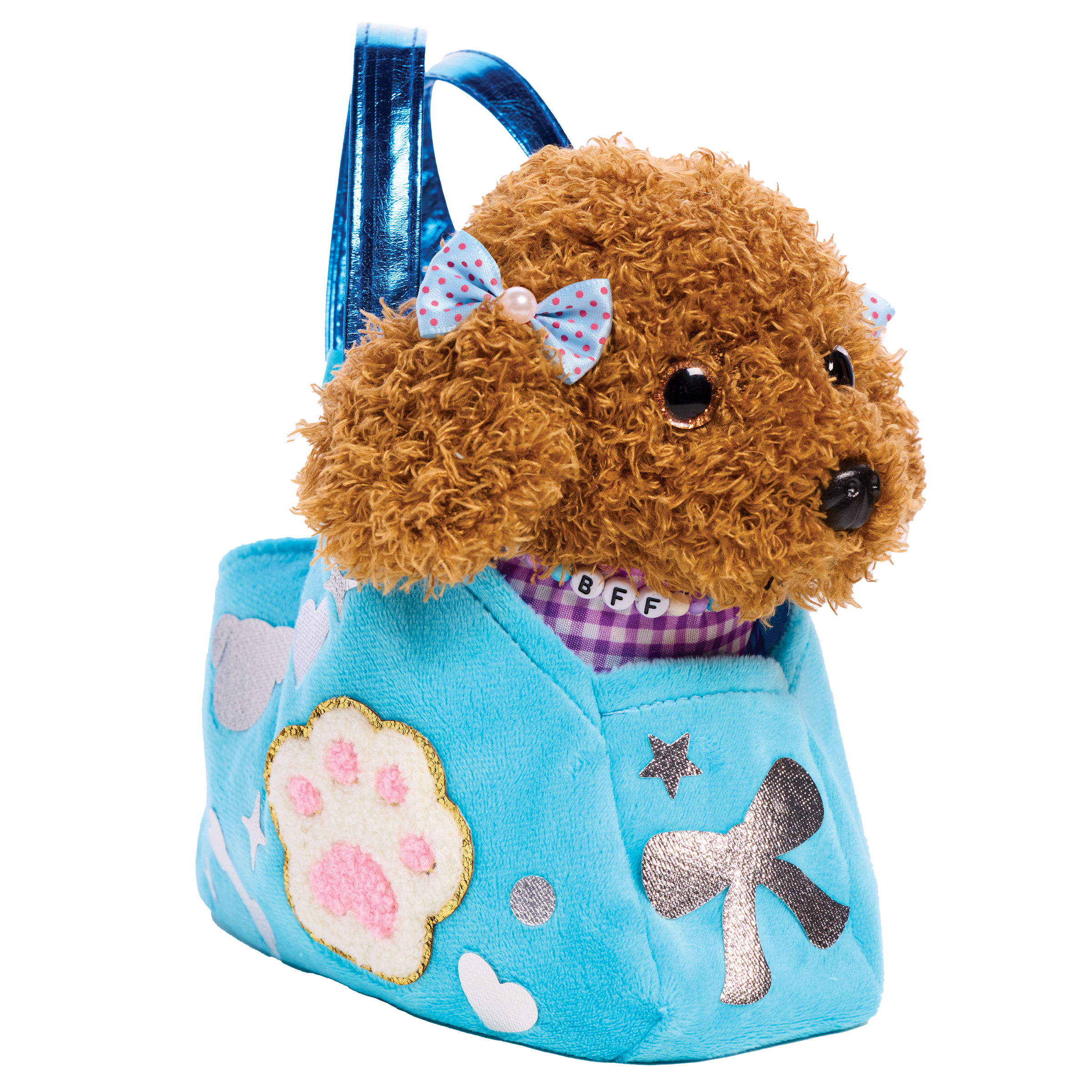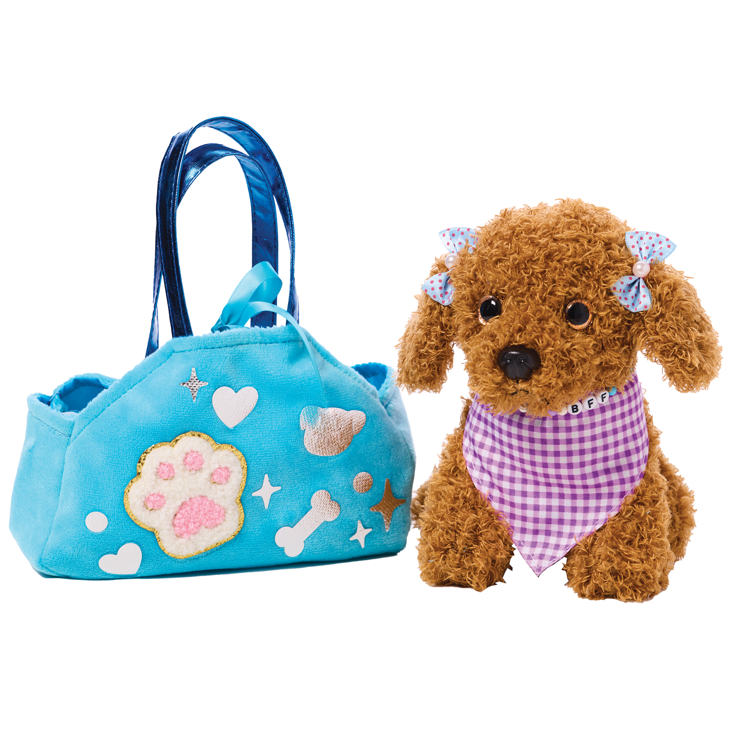 Decorate and accessorize your diva doggie's posh purse, velvet collar, satin leash, velvet cape, satin bows and dog bone name tag. Quick and easy peel-and-press felt accents and rhinestones means no glue or scissors are needed. Develops fine motor skills, fosters imaginative play and promotes sensory development. Designed to comfort and cuddle, your completed purse measures 7" w x 5" h x 2-1/2" d. Dog measures 6-1/2" w x 6" h.