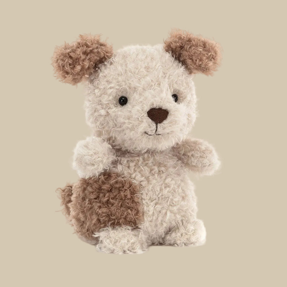 Little Pup has absolutely no idea what he’s doing, but he’s doing it with conviction. A soft-footed optimist in cocoa and cream, he’s recently appointed himself Head of Welcome at the Jellycat Post Office, watched over by Derreck Dog.