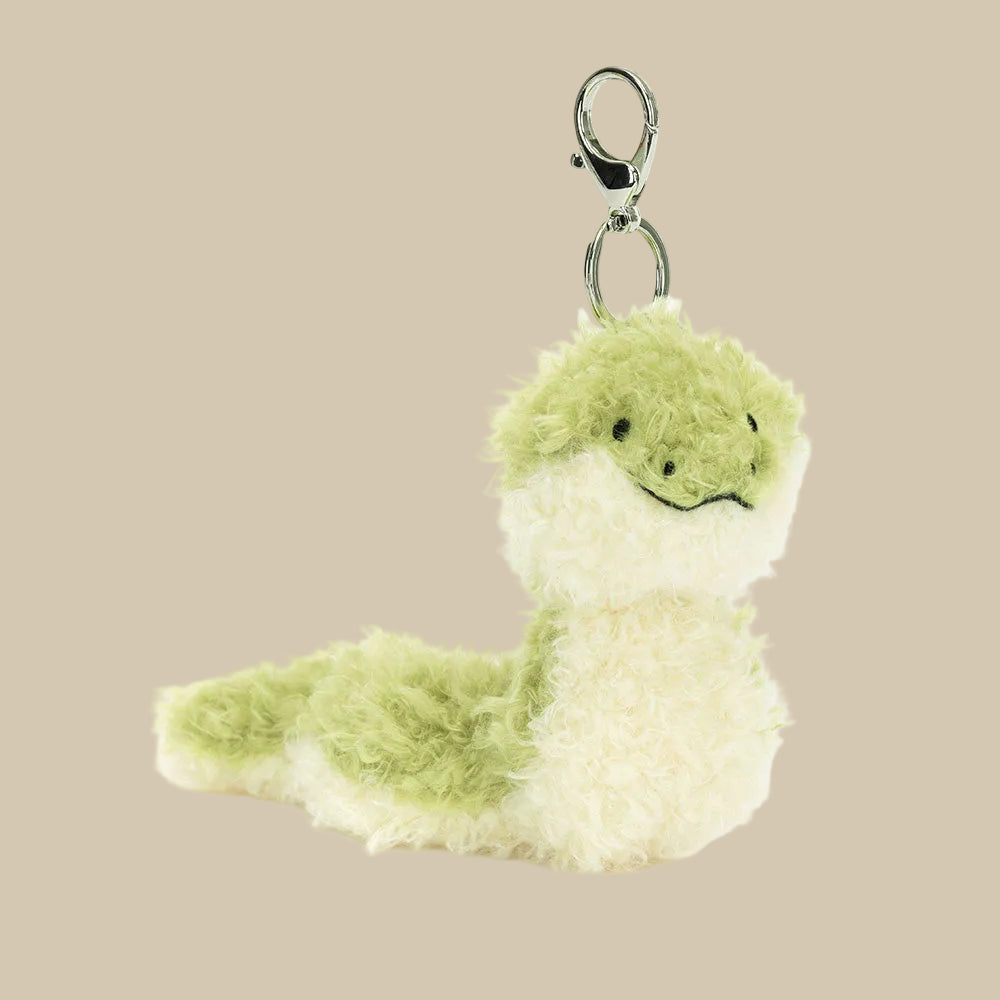Little Snake Bag Charm is ready to slither along on every adventure. In tousled green and cream fur with embroidered facial features, this smiling serpent has a silver claw clip and Jellycat tag to attach to any bag for a ride-along reptile.