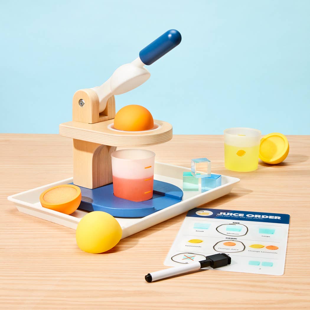 Easy-Squeezy Juicer, DIY Juice Making Kit for Kids  from KiwiCo! PRETEND PLAY MEETS EARLY MATH: Serve up colorful drinks while practicing essential math skills like measuring and counting. Turn playtime into a fun educational experience! MATH MADE FUN: Perfect your measuring skills and practice counting as you make the perfect drink for every order! INTERACTIVE ORDERS: Take customer requests on the order board and build social and organizational skills through pretend play! COLOR-CHANGING MAGIC: Watch cups transform as you juice toy lemons and oranges in cold water! Complete Set Includes: Wooden juicer, play fruit, 3 ice cubes  2 color-changing cups, order board Dry-erase marker, mess tray, grownup guide Create endless fun and learning with this juice-making adventure today!
