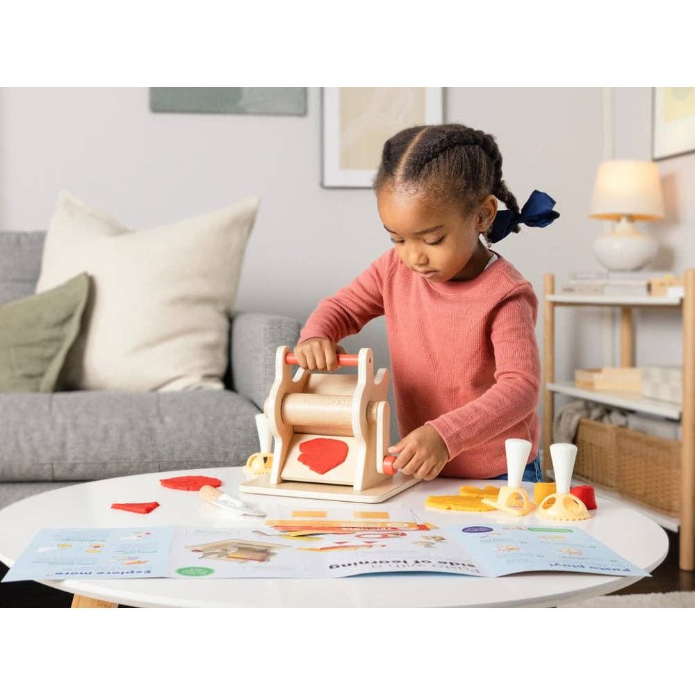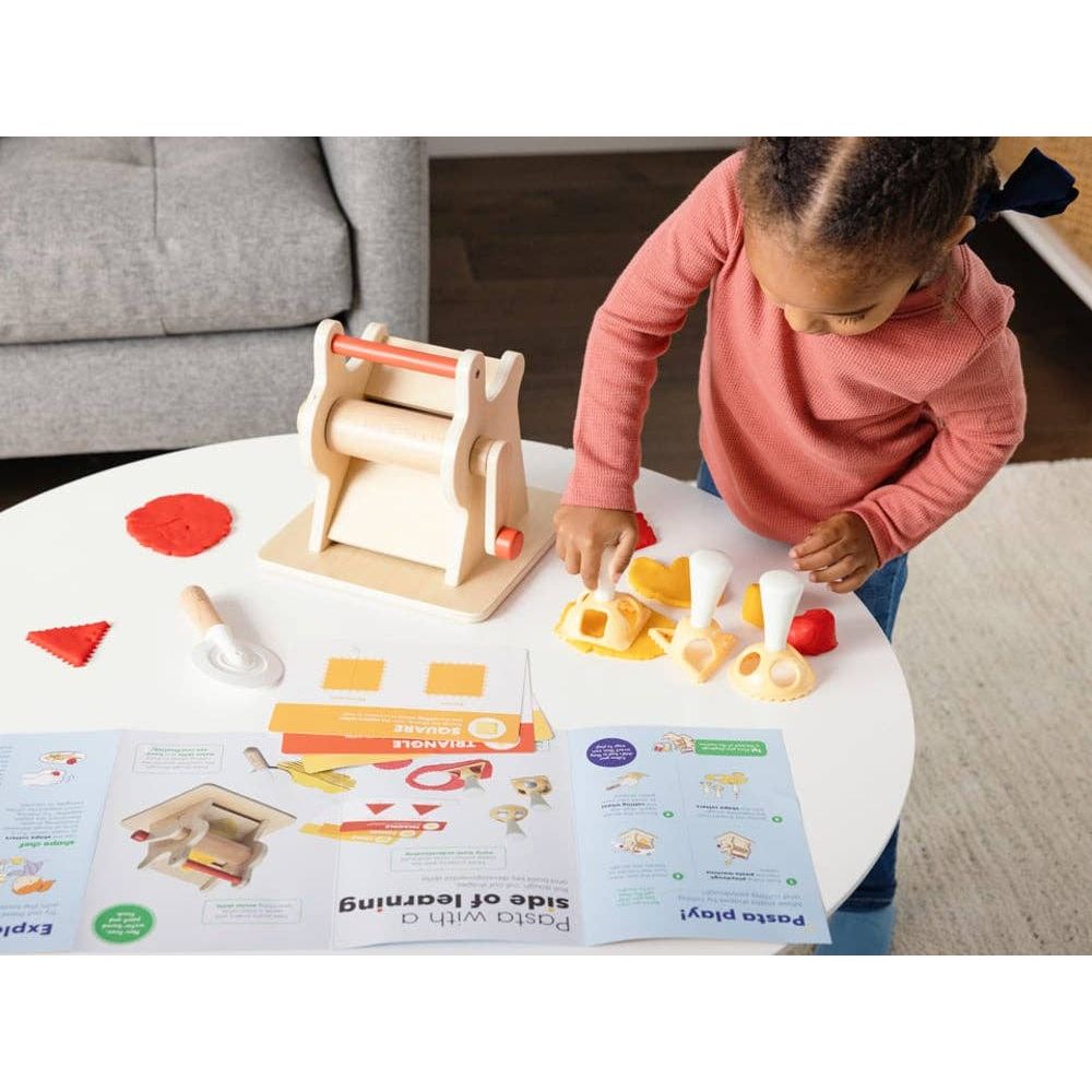 Roll and stamp your way to early math exploration — with the help of kid-friendly kitchen play! Use the pasta machine to explore pasta making and shapes with the shape pattern cards, then learn how to make circle, triangle, and square ravioli. The pasta-bilities are endless when it comes to math learning in the kitchen! Includes: play pasta machine, red playdough, yellow playdough, circle shape cutter, square shape cutter, triangle shape cutter, cutting wheel, shape pattern cards, grownup guide