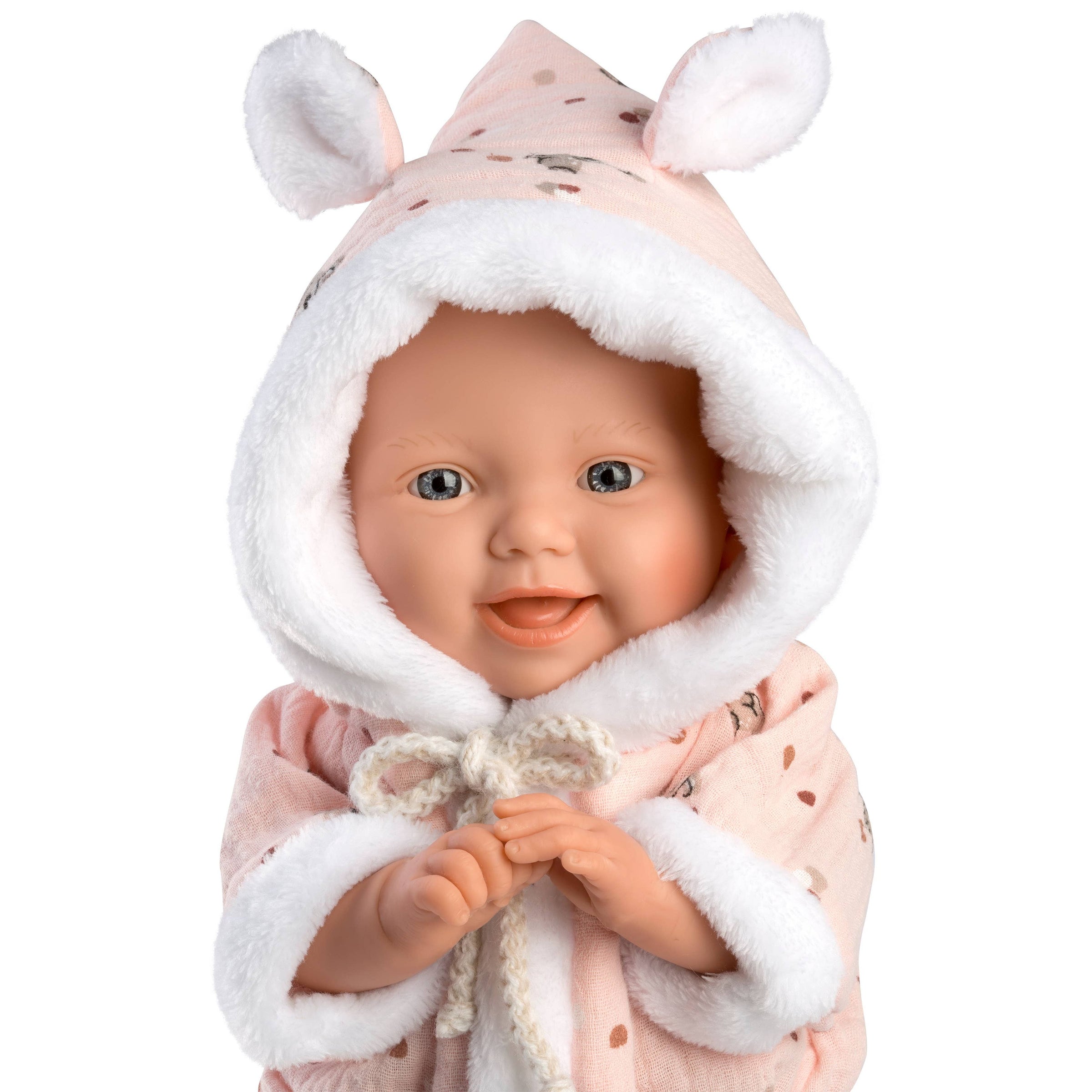 Penelope's sweet face is sure to be a delight for young children. She is dressed in pink pajamas with bunnies and white fleece trim with bunny ears.