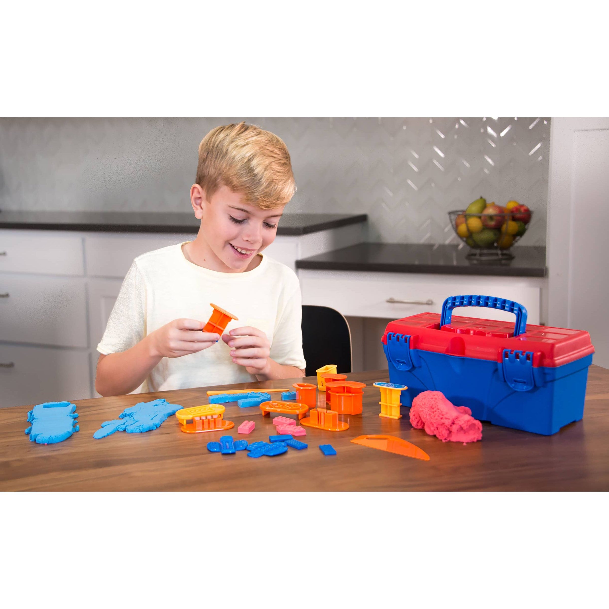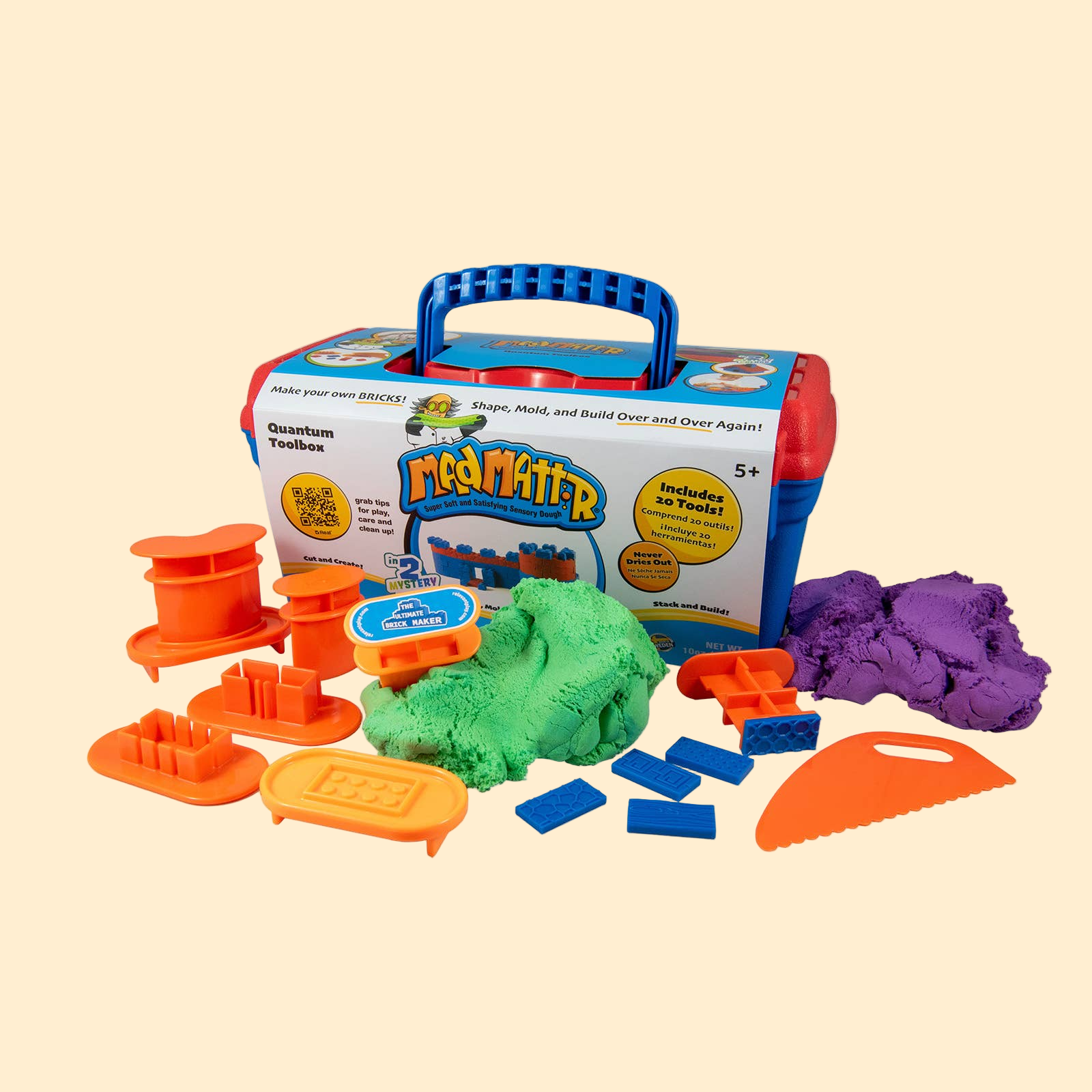 Kids of all ages will expand their Mad Mattr building prowess with the amazing Mad Mattr Tool Box! With 20 tools and two 5oz packs (Mystery colors) of Mad Mattr included in the portable toolbox, there are endless ways to maximize your construction play. Press it, mold it, squish it, and sculpt it. What will you build?