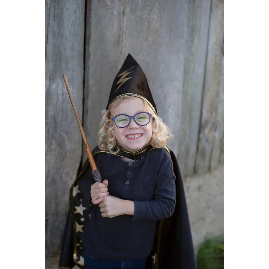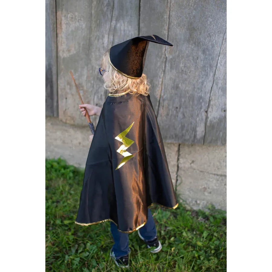 This reversible wizard cape is the perfect wizarding cape. Fight the evil dark wizard in style with this 2 piece cape set and pointed hat. A golden lightning bolt is featured on the black satin side and reverses to a sea of golden stars on black satin. The wizard hat features a soft elastic chin strap to keep your hat in place while casting spells and a large matching bolt for extra magical powers. Proudly made in Canada.