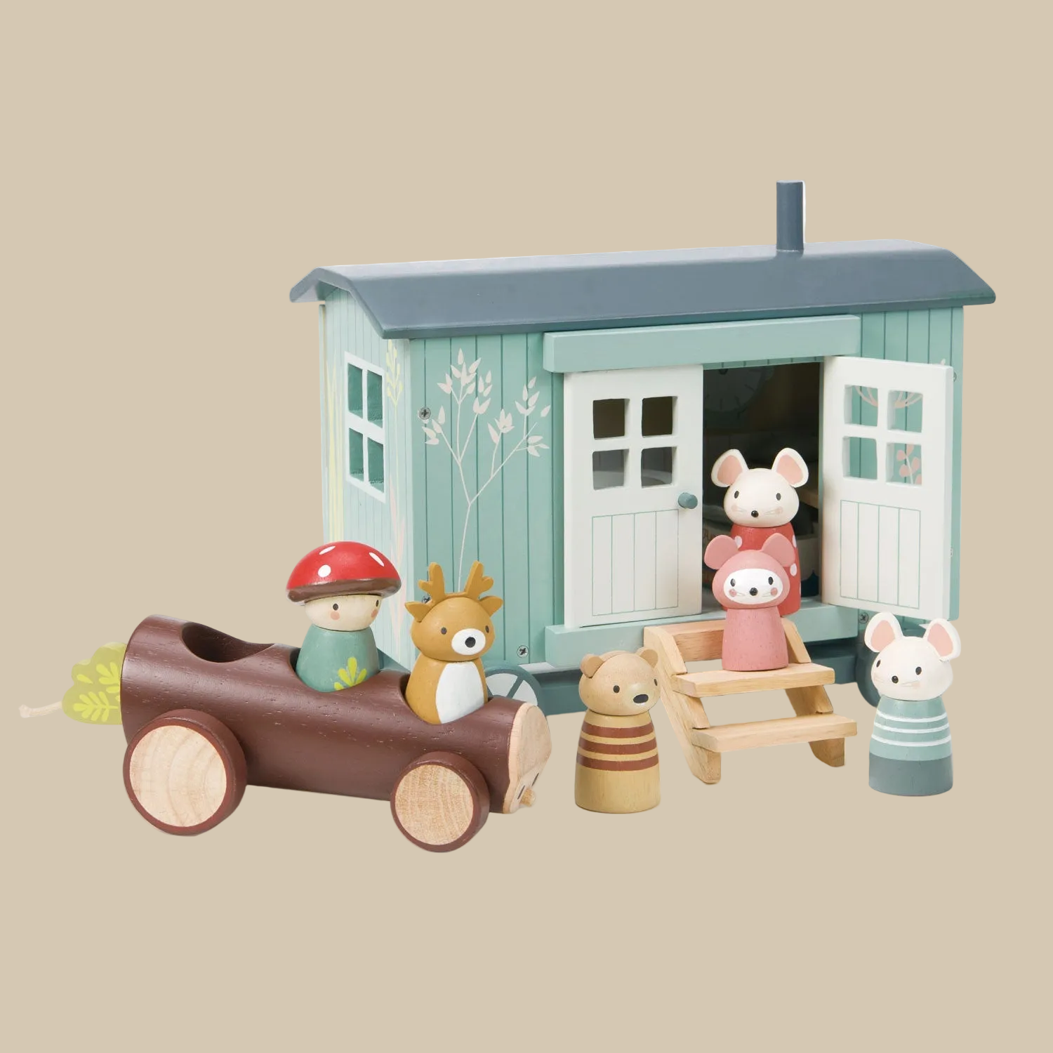 A wonderful addition to our Merrywood Tales collection. This shepherd’s hut is the perfect glamping staycation for our new family of mice. They have borrowed some human-sized trinkets to use as essential furniture in their hut. A teacup makes