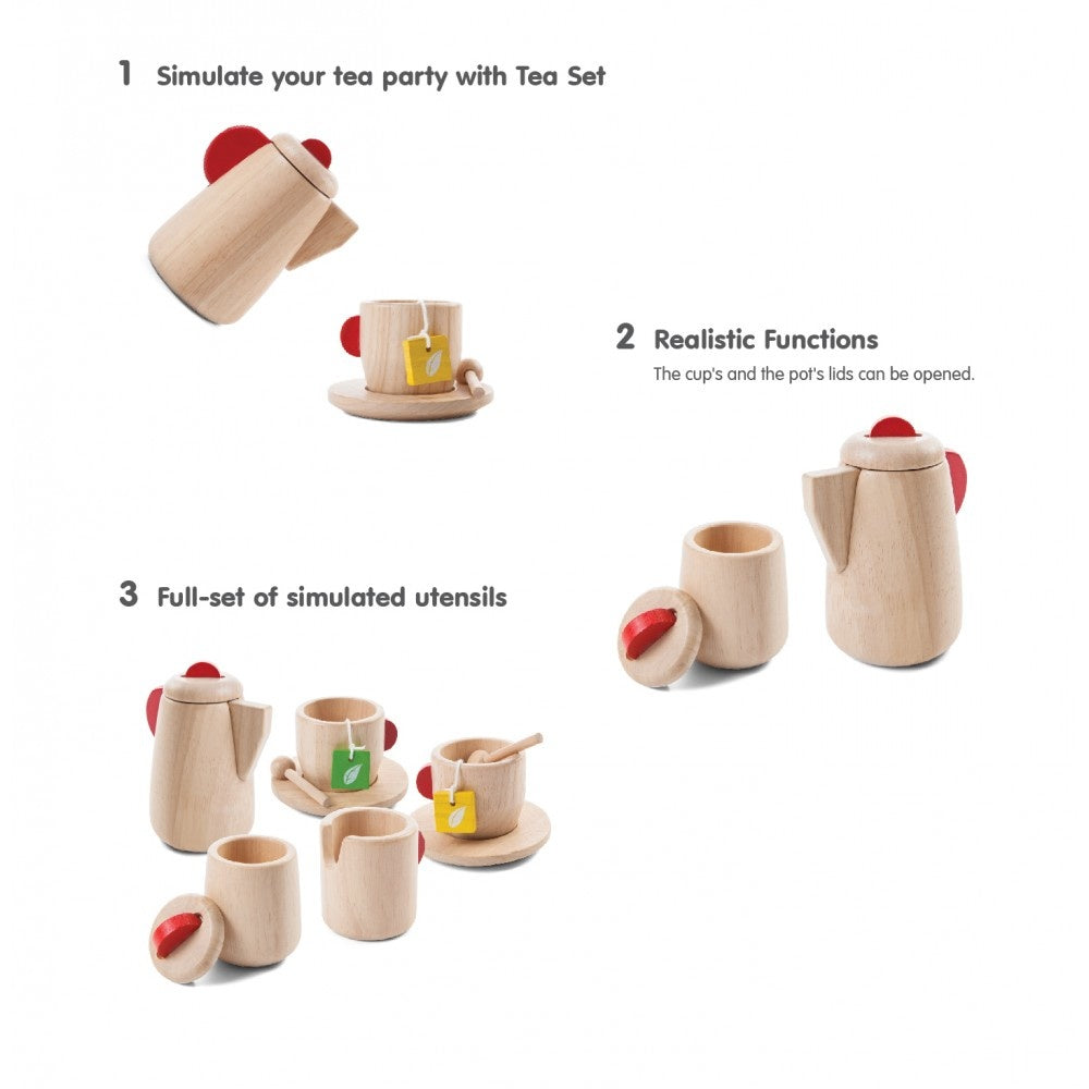 A hot cup of tea is ready to be served! This Tea Set consists of a teapot, a sugar bowl, a milk pitcher, 2 tea cups, 2 saucers, 2 tea spoons, 2 tea bags and 2 cubes of sugar. Suitable for children 3 years and up.